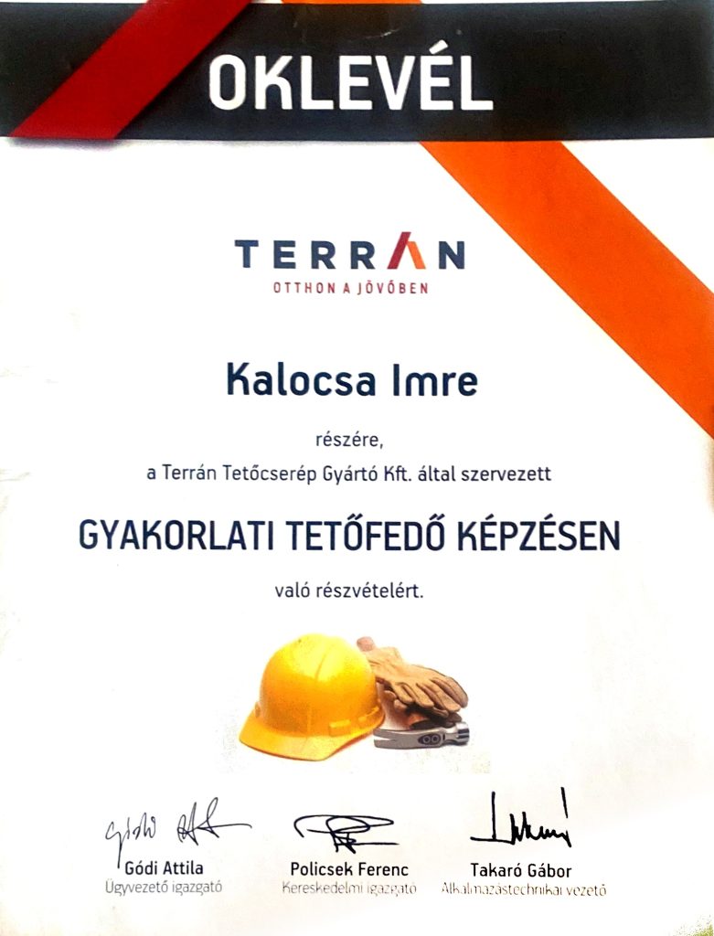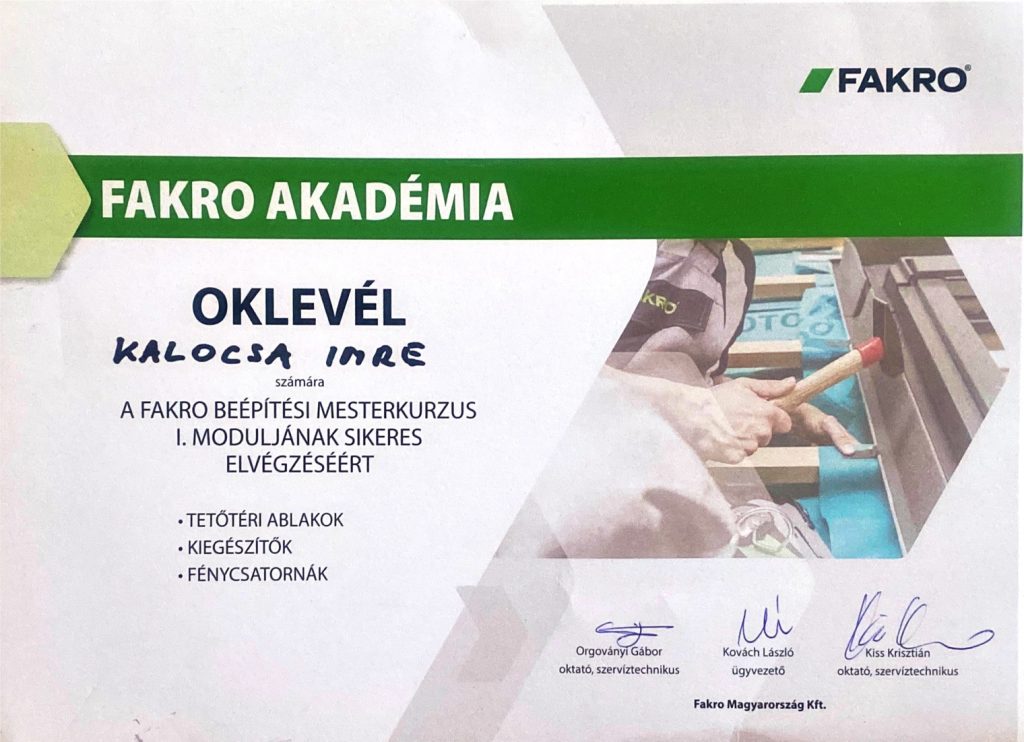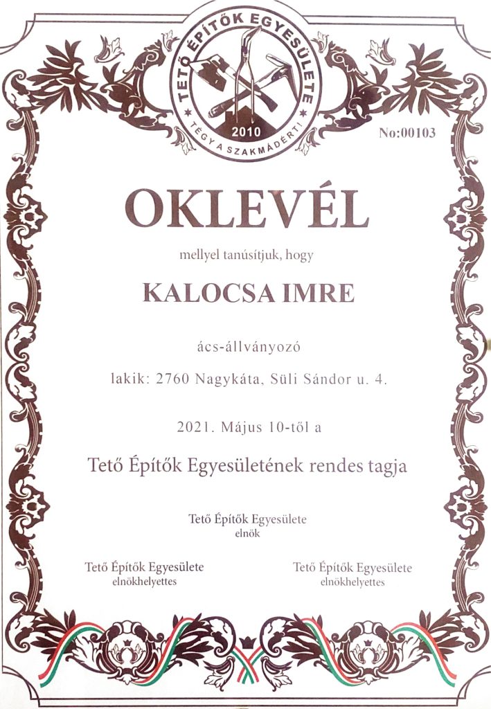 Minőségi munkáim elismeréseként mára a legnagyobb három márka (Farko, Roto, Velux) ajánlott beépítőjeként vagyok nyilvántartva Magyarországon. Nevem ott szerepel a gyártók partnerlistáin is. Tagja vagyok a Tető építők Egyesületének. 100 fő feletti taglétszámával ez az egyesület képviseli az ország legkiemelkedőbb szakembereit.